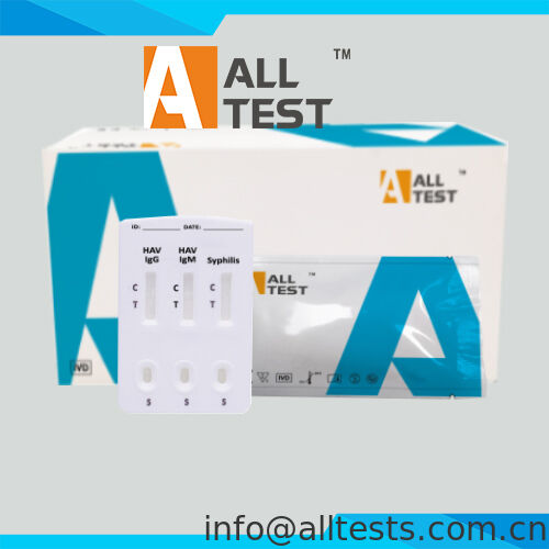 The HAV IgG/IgM&Syphilis Combo Rapid Test (Whole Blood/Serum/Plasma) is a rapid chromatographic immunoassay for the qualitative detection of IgG and IgM antibodies of Hepatitis A virus and antibodies of Treponema Pallidum (TP) in human whole blood, serum or plasma specimen to aid in the diagnosis of Syphilis and HAV infection.