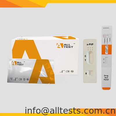The α-PVP Surface Test is a rapid immunochromatographic assay for the qualitative detection of alpha-Pyrrolidinovalerophenone at the cut-off of 1000 ng/mL.